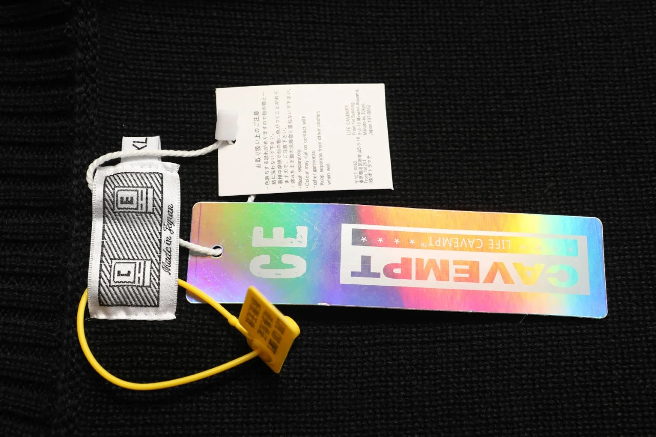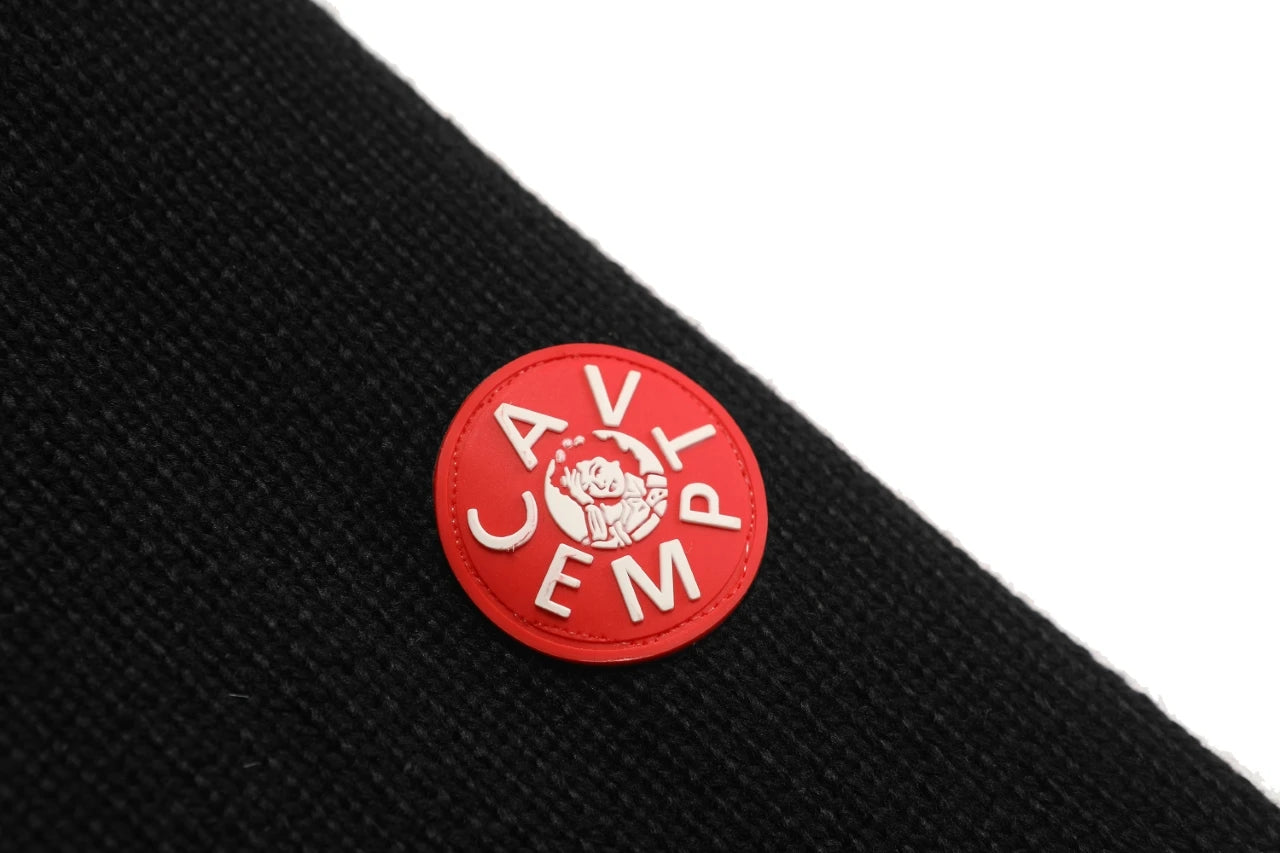 Heavy knit sweater with a mockneck and full-length zipper. Features bold CAVEMPT text on the back and a minimal red patch on the sleeve. Clean, structured silhouette with a relaxed fit.